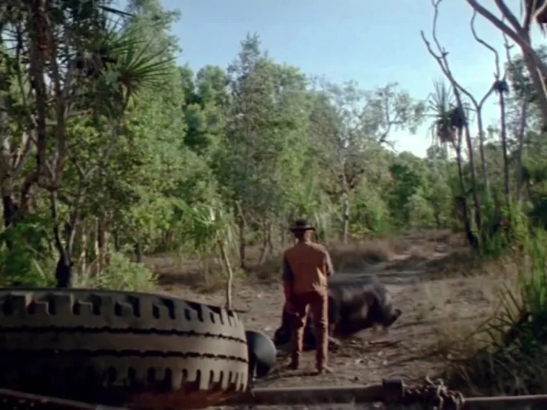 Mick and Sue head further into the bush but are stopped by a water buffalo that refuses to budge. The scene was shot on the road between Jabiru and Gunbalanya, with Mick solving the impasse by hypnotising the water buffalo.