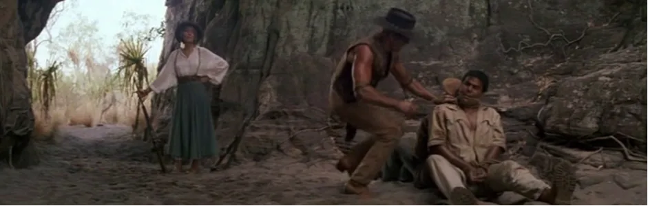 The scene involves Mick using an Aboriginal ‘bullroarer’ to make a bush ‘telephone call’, calling on help from whoever is nearby. In a convoluted plot, Wally (played by John Meillon) has been captured by an American gang who are trying to lure Mick to their trap. Wally tells the spooked baddies the whirring noise is that of a ferocious bird who can carry away humans.