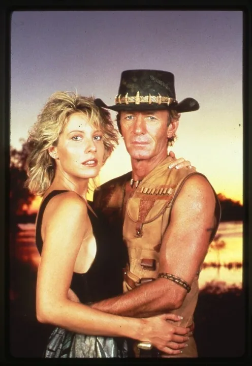 Sue Charlton, played by American actor Linda Kozlowski, arrives at ‘Walkabout Creek’ and her first encounter with ‘Mick’ Dundee (played by Paul Hogan) is when he announces his arrival at the pub she is staying by throwing his hunting knife at the bar and wrestling a stuffed dead crocodile.