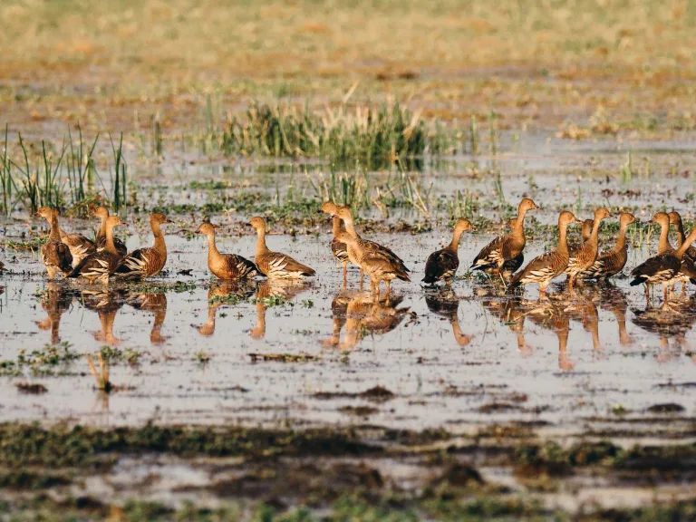 The fringing woodlands are home to more species of plants and animals than any other Kakadu habitat. In the early mornings and evenings, agile wallabies move out of the woodlands to graze beneath the paperbark trees by the billabong.