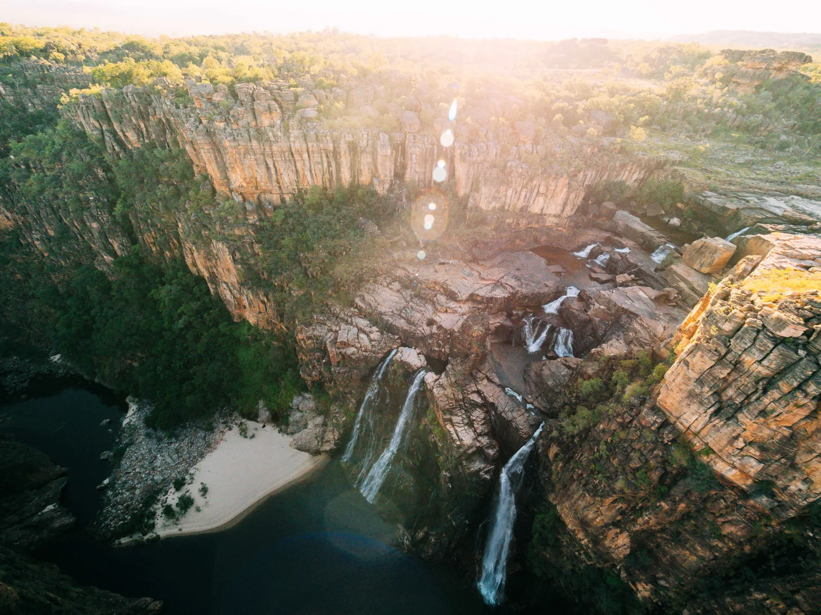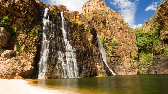 Twin Falls and Jim Jim Falls share the same escarpment system, carved by millions of years of monsoonal rain and tropical floodwaters. While Jim Jim roars with power, Twin Falls’ dual streams symbolise balance — two forces flowing together in harmony.