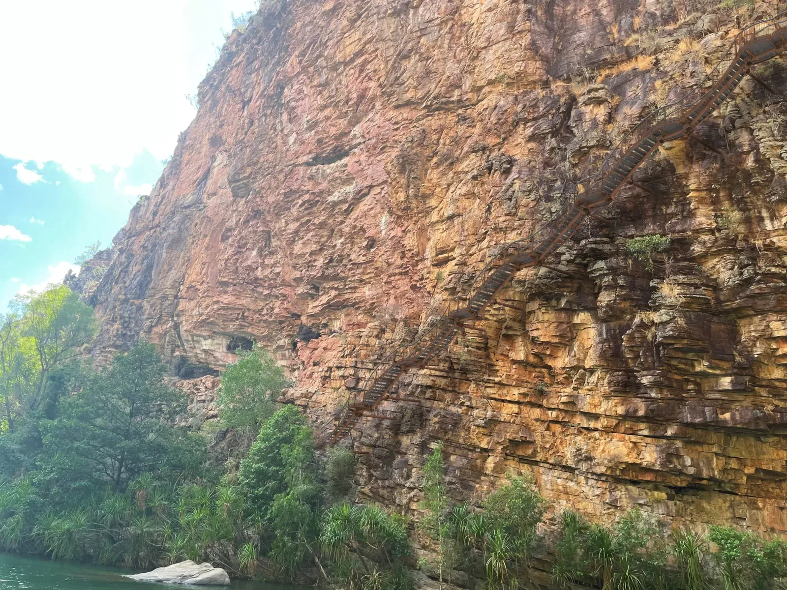 After disembarking, follow the floating boardwalk upstream, weaving over rocks and boulders as the twin cascades come into view — a sight that captures the wild heart of Kakadu.