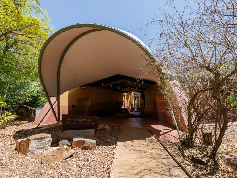 Warradjan is the Kundjeyhmi word for Pig-Nosed Turtle, an inhabitant of the nearby Ngurrungurrudjba (Yellow Water Billabong) and native species found within Kakadu National Park. This is significant not only for its name, but also for the salient shape of the building, which reflects circular gatherings and way of communication of Bininj/Mungguy people.