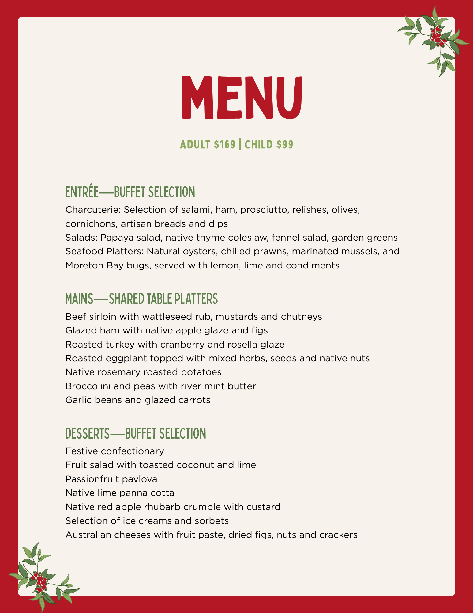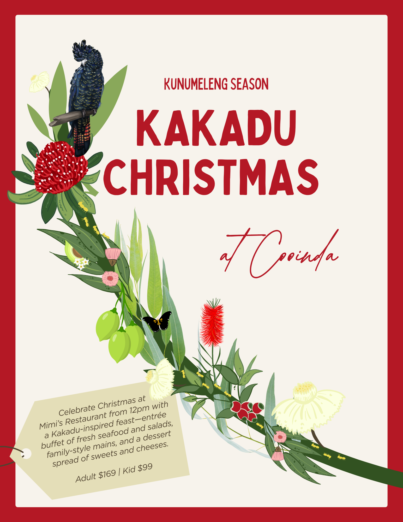 Celebrate Christmas with a dining experience inspired by the native flavours of Kakadu. Begin with an entrée buffet of fresh seafood and salads, enjoy family-style mains at your table, and finish with a dessert buffet of confectionary and artisan cheeses. A festive journey of taste, connection, and the spirit of the Kunumeleng season.