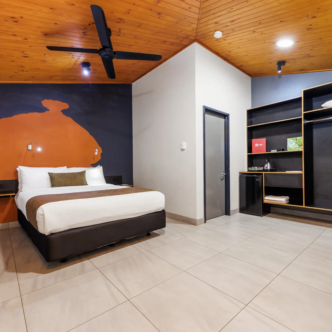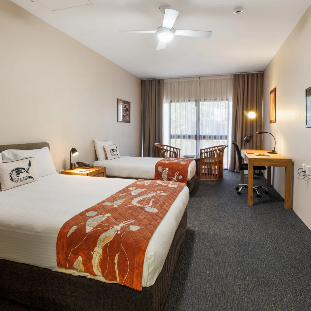 Unwind in our family lodge rooms with air conditioning, mini-fridge, tee & coffee amenities, TV, ensuite, and terrace—perfect for up to 4 adults after a day in Kakadu.